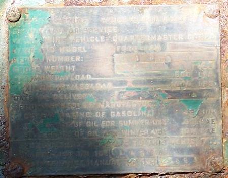 | * The hood number for GPW 21987 mathematically should be 20106987. This is based on Ford GPW production numbers relative to the U.S. Army registration numbers assigned to that group of vehicles. Not all vehicles were accepted in sequential order. Some vehicles were used for testing by the factory, and others had production flaws and were accepted later. These vehicles were not assigned a registration number, so there are gaps in the mathematical process. |