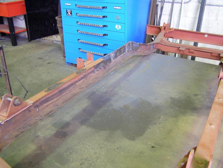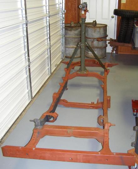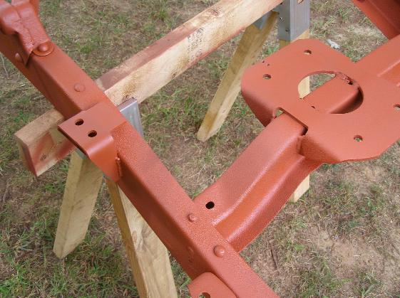 | GPW 69289 Frame, above photo. Once the frame had been fitted with replacement sections and the front bumper and transmission cross member had been fitted for final alignment the frame was crushed glass blasted one final time prior to final painting with red oxide primer. |