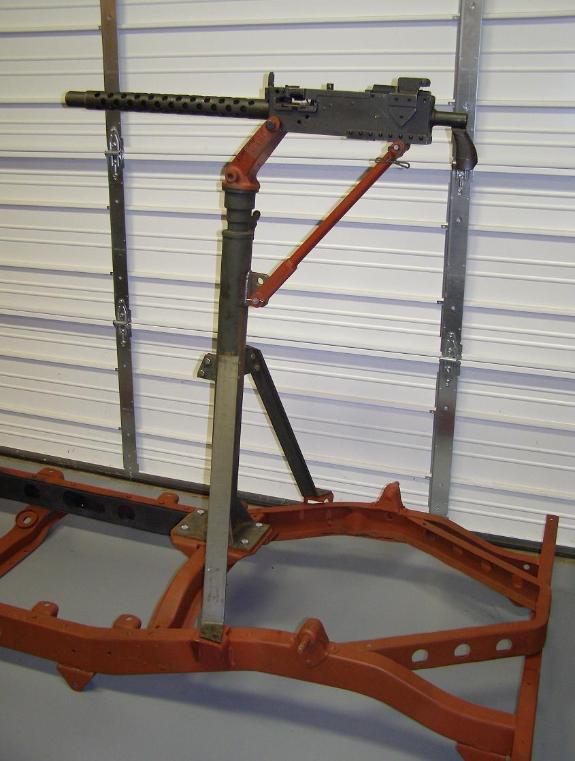 | M-31C Nomenclature Plate and Gun Pedestal Frame Mounts, above photo. when using the M-31 Pedestal due to the recoil of the gun. Special mounts had to be added to the frame of the MB/GPW This modification was not done at the factory but rather by ordnance units in field depots. M-31 Machine Gun Mount, left picture. Pictured here is the M-31 Machine Gun Pedestal, Cradle and M-1919A4 .30 Caliber Machine Gun. Note the front leg is not currently attached in this photo. This M-1919A4 Machine Gun is a BATFE compliant non-gun with a dummy right side plate and no internal working parts. |
