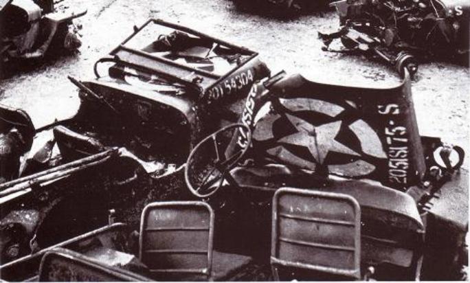 | The hood number for GPW 69289 mathematically should be 20154290. This is based on Ford GPW production numbers relative to the U.S. Army registration numbers assigned to that group of vehicles. Not all vehicles were accepted in sequential order. Some vehicles were used for testing by the factory, and others had production flaws and were accepted later. These vehicles were not assigned a registration number, so there are gaps in the mathematical process. The GPW (in the left photo) has a hood number of 20154304, mathematically 14 numbers from the proposed hood number of GPW 69289. This photo was taken of a vehicle salvage yard in France, late 1945. |