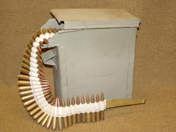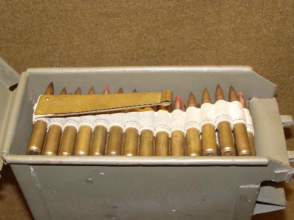 | .30 Caliber D38571 Ammunition Box, above left and right photo. The D38571 .30 Caliber Ammunition Box was specifically designed to be permanently mounted to the side of the M-1919 Machine Gun. This box held 250 rounds of belted Ammunition. Picture here is the early style cloth non-disintegrating style belt holding .30 caliber ammunition. This belt is loaded with one tracer round for every four ball rounds. This ammunition box will be mounted on the M-1919A4 Machine Gun pictured above. |
