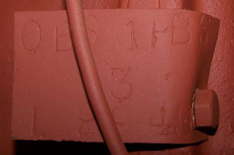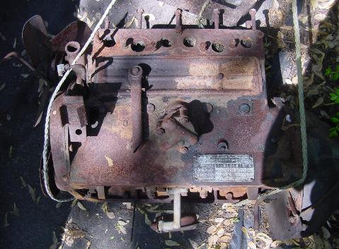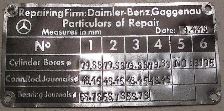 | Engine, above left photo. This is a view of the engine rebuild data plate prior to removal. The aluminum plate was riveted to the driver's side of the engine with copper rivets. Engine Rebuild Plate, above right photo. This is a close up of the data plate after removal, restoration and repainting. This engine was rebuilt on April 9th 1948. Note that all of the rebuild sizes are metric. |