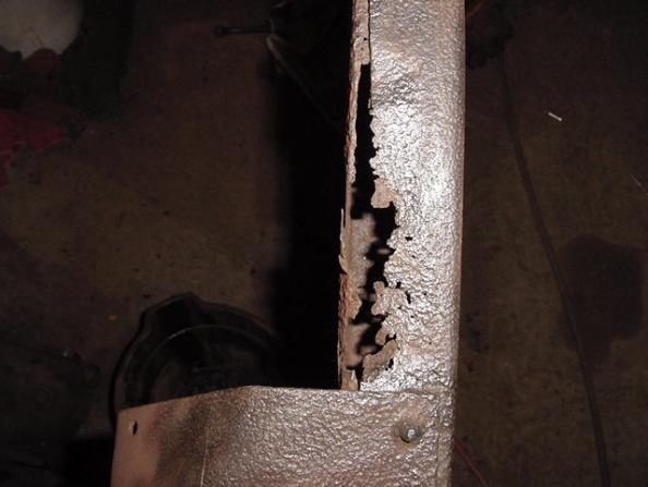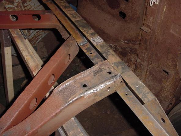 | Reproduction front Bumper Gussets being added, above left photo. The original gussets were not able to be salvaged. This view is from the bottom of the frame. Note the "F" marks on these reproductions. Although nicely marked, the small "F" will be hidden by the bumper. Underside of frame, passenger side, behind motor mount, above right photo. Many GPW's have this type of corrosion due to mud and water collecting in the bottom of the frame rails. |
