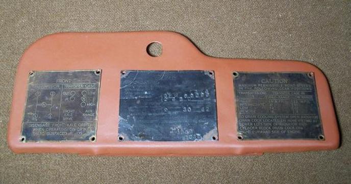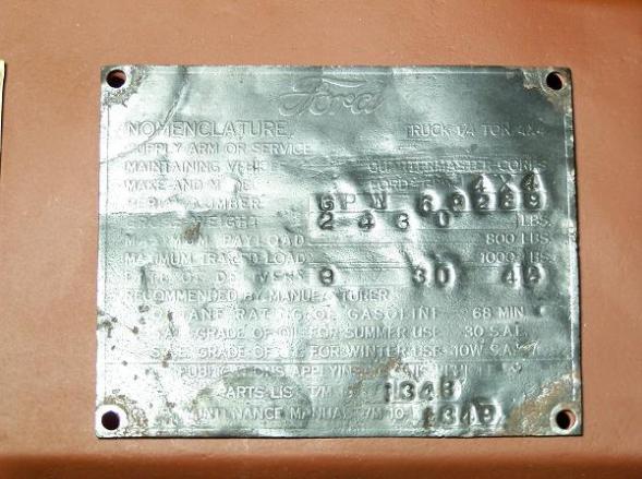 | Original brass Ford "Shift Plate", left photo. This style of plate was used from the beginning of GPW production through late 1942. Original steel Ford "Delivery Plate", right photo. Note that the servicing organization is the "QUARTERMASTER CORPS". This was changed to the "ORDNANCE DEPARTMENT" on vehicle plates after December 3rd 1942. This type of plate was used on GPW's from late 1942 until 1944. |