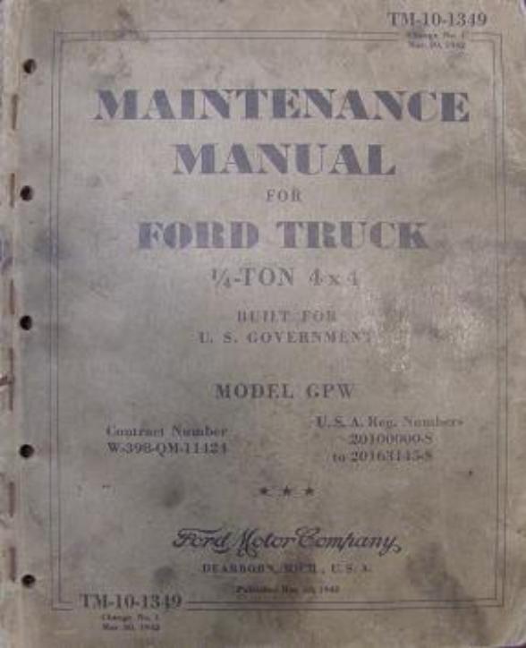 | Parts Manual TM-10-1348 Change No. 1 April 10 1942, above left photo. Maintenance Manual TM-10-1349 Change No. 1 March 30 1942, above right photo. These two manual are would have been issued with GPW 69289. Both are for Ford Contract Number W-398-QM-11424 U.S.A. Registration Numbers 20100000 to 20163145. |