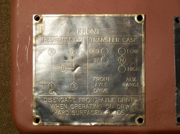 | Original brass Ford "Caution Plate", above photo. This style of plate was used from the beginning of GPW production through late 1942. Note the early Transfer Case High Range speed of 65 M.P.H. Later "Caution Plates" reduced this speed to 60 M.P.H. |