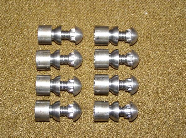 | Restored passenger side front frame, left photo. Reproduction "F" marked GPW bumper, "F" marked bumper gussets and spring shackle added. The bumper gussets and spring shackle have been correctly welded to the front frame. The bolts mounted on the bumper and spring shackle were added ONLY for welding and alignment. These will be removed prior to full restoration. Replica bumper gusset and spring shackle rivets, above right photo. These replica rivets were specifically designed to replicate the original rivets in the bumper gusset area. When torqued down, the round end cap will sheer off simulating a factory applied rivet. The four longer rivets on the bottom are for the spring shackle area. |
