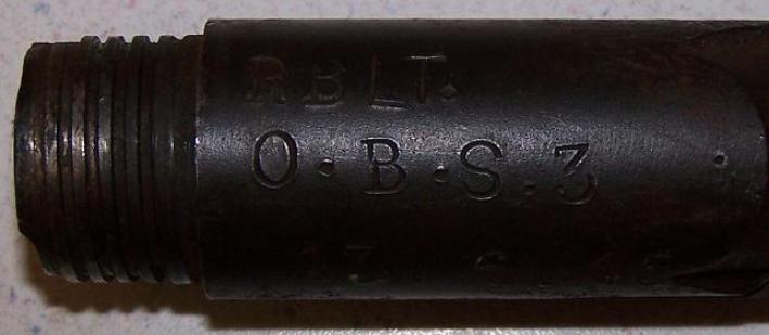 | Rear End Rebuild Plate, above left photo. When 69289 was disassembled for restoration a data plate was found on the rear end housing (shown restored in red oxide primer, left photo). The data plate is marked: OBS 1 PBS 3 1 29 45 This translates to: Ordnance Base Shop 1 Peninsular Base Section 3. This rear end was rebuilt on January 29th 1945. OBS 1 PBS 3 was located in Pisa, Italy in January 1945. Ordnance Base Shops (OBS) rebuilt all types of equipment. The photo to the left is a M-1 Garand Barrel. The barrel is factory marked: D35448-I6-R 103 This barrel is a replacement that was installed on a war weary M-1 Garand. When the barrel was replaced, the OBS hand stamped it: RBLT. O.B.S.3 13. 6. 45 |