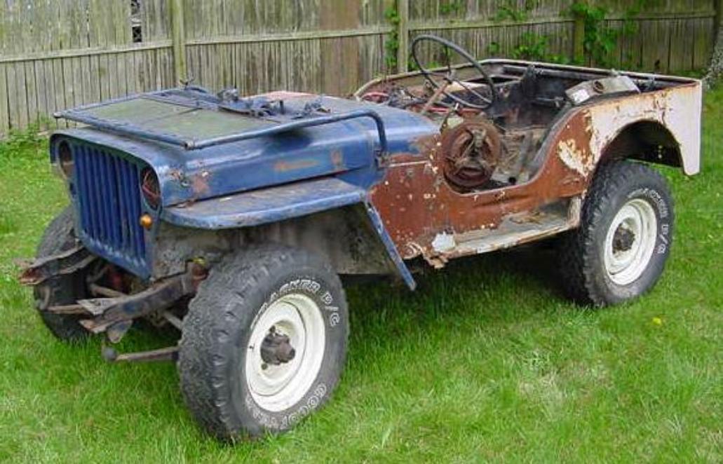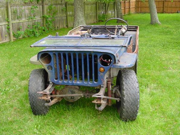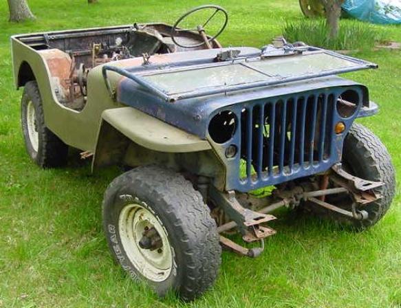 | Front and passenger side of the 1943 MB, above two photos. The front bumper is missing as well as the head lights, marker lights, black out driving light, and all of the engine components. The original T-84 transmission is present. |