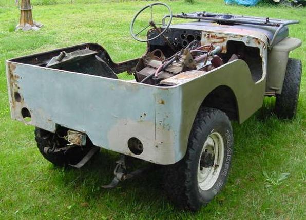 | Rear view of the 1943 MB, left photo. Both bumperettes, the trailer pintle hook, spare tire carrier, trailer socket and gas can carrier are missing from the rear. All of the handles, tail lights and reflectors are also missing. The engine sitting inside of the body tub is from a post-war Willys CJ. |