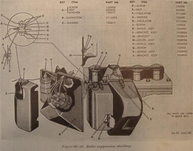 | Engine Radio Suppression Boxes, left photo. These boxes were mounted over the Coil, Distributer and all four Spark Plugs. These boxes added additional radio suppression for vehicles with radio systems. These boxes were added at the depot level when radio systems were installed, and not in the factory. This system is believed to have been implemented during the middle of 1943. Radio Suppression Shielding diagram from ORD-9 SNL G-503 Manual, right photo. |