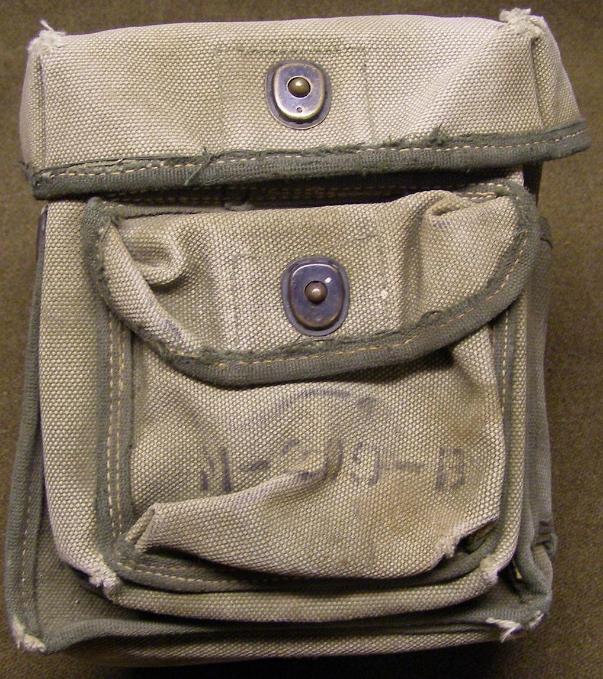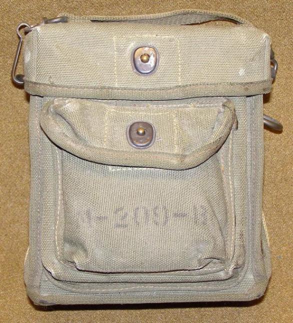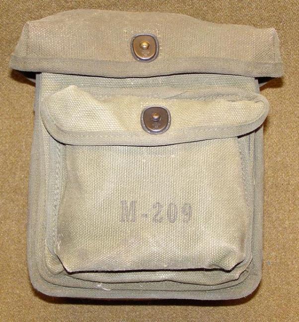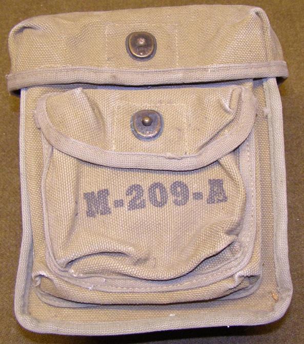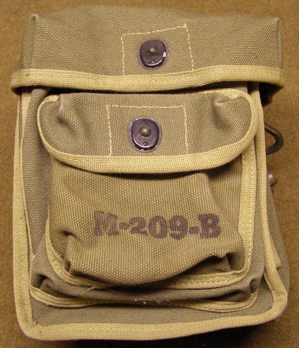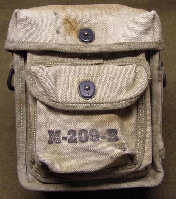 | M-209 Cipher Machine Carry and Storage Bags, above photos. The bag pictured on the left is marked for the M-209-B Cipher Machine and is constructed from olive green canvas with khaki canvas edging. The front is marked M-209-B in black ink.. The bag pictured on the right is for the M-209-B Cipher Machine and is constructed from olive green canvas. This bag has very late war style M-209-B stenciled on the front in black. |