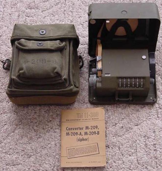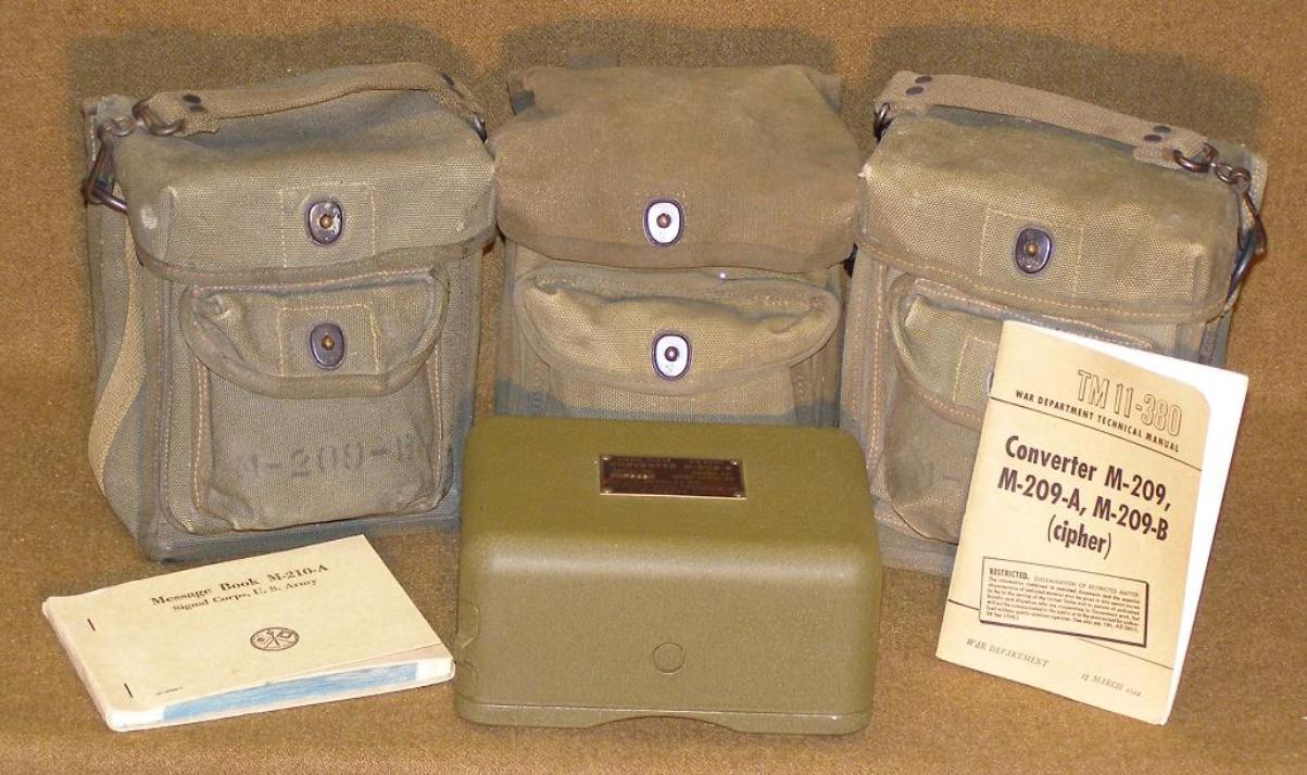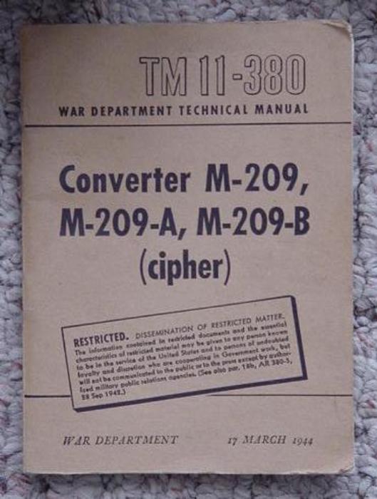 | M-209 Cipher Machine, above photo. Several M-209 Cipher items in the QuestMasters collection: 2 variations of the M-209-B Carry Case, 1 M-209 Carry Case, M-210-A Message Book, M-209-B Cipher Machine and TM 11-380 Manual for the Converter M-209, M-209-A and M-209-B dated 17 March 1944. |