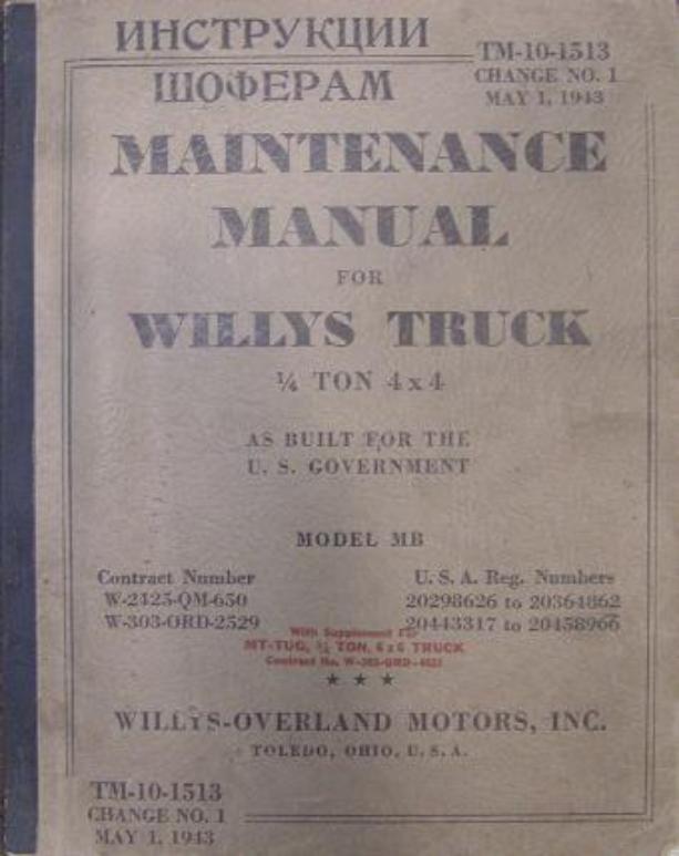 | This is the original TM-10-1513 Maintenance Manual that would have been issued with MB 241969. It is dated: Change No. 1 May 1, 1943. Contract Number: W-2425-QM-650 U.S.A. Reg. Numbers: 20298626 to 20364962 and Contract Number: W-303-ORD-2529 U.S.A. Reg. Numbers: 20443317 to 20458966 This manual is also written in Russian for Lend Lease vehicles. There is also a supplement section for the MT-TUG 3/4 Ton, 6x6 Truck, Contract No. W-303-ORD-4623. |