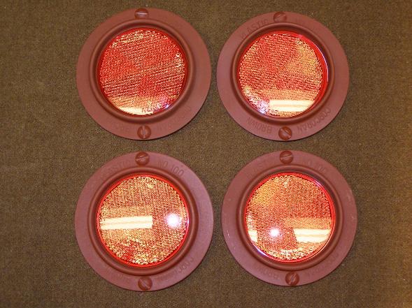 | Headlight brackets, above left photo. Reflectors, above right photo. These reflectors are marked CORCORAN BROWN PLASTIC NO.100 |