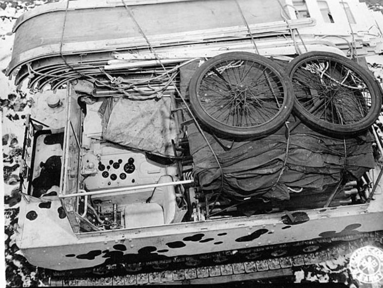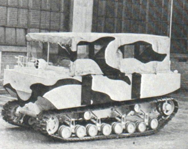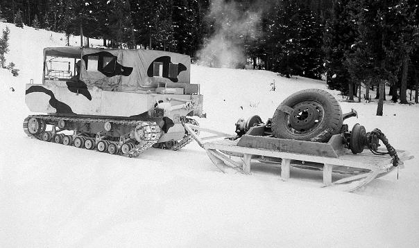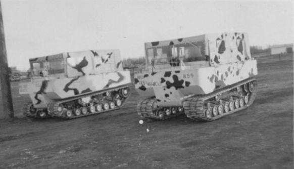 The T-24 and early M-29 Weasel is strongly believed to have been delivered solely from the factory painted in white paint with a black camouflage pattern. The following pictures depict several camouflage patterns used on Weasels prior to being painted Olive Drab later in the war. |
