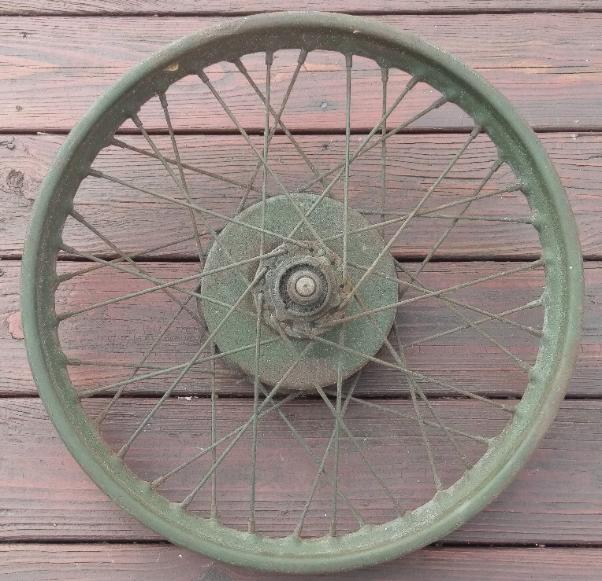 | BSA M20 Front Wheel, New-Old-Stock, Original Paint, above two photos. This front wheel assembly was supplied by the War Department as a complete spare parts assembly Part Number 66-5536 and issued without front brake and tyre (tire). This original New-Old-Stock World War Two production wheel as found in Greece and had never been fitted to a motorcycle. The Front Wheel Assembly, with WM1-20 rim with spindle and bearings, less brake and tyre are Part Number 66-5534 and listed on page 66, BSA Catalogue of Replacement Parts for all 1940 Models and listed as Part Number 66-5536 page 12, Spare Parts List for BSA 500cc S.V. Model WD/M20 Contract S 2603. |