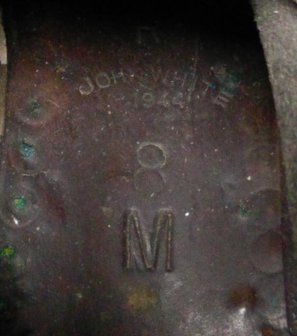 | British Dispatch Riders Boots, above photos. Motor Cyclists were issued boots specifically to be worn over their Pantaloons. Unlike the standard issue low-top "Ammunition Boots" issued to all British ground forces, these boots had nine pairs of lace-up eyelets and three buckle tops. The examples shown here were produced by John White in 1944 and are a size 8, Medium. They are also marked WD (War Department) with the British Broad Arrow and 164. |