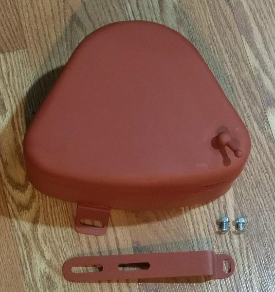 | BSA M20 Tool Box, above two photos. This M20 Tool Box was removed from M20 Serial Number 117108 and has been restored with closing handle and brackets. This M20 Tool Box is Part Number is 65-9038 with 65-9028 Screw Fastener, 65-9021 Tool Box Strap with (2x) 15-7161 Bolt (1/4"-26x1/2"), (2x) EB113 Nut (1/4"-26) and (2x) 29-541 Shakeproof Washer (1/2" External Diameter, External Tooth), 27-9001 Clip with A176 Distance Washer, 24-225 Bolt, 29-541 Shakeproof Washer (1/2" External Diameter, External Tooth), K234A Washer, M263 Nut, and 15-7171 Mudguard Bolt (1/4"-26x1/2"), K197 Spring Washer (1/4") and EB113 Nut (1/4"-26) page 108 and 109, BSA Catalogue of Replacement Parts for all 1940 Models and page 20, Spare Parts List for BSA 500cc S.V. Model WD/M20 Contract S 2603. |