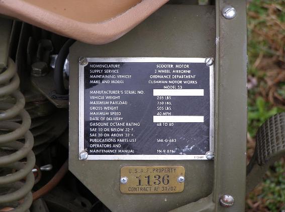 | Reproduction nomenclature plate, above left photo. The exact serial number of this Cushman 53 Scooter is not currently known. The brass data plate under the nomenclature plate is believed to be a post-war registration plate applied after 1947. |