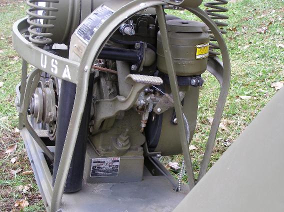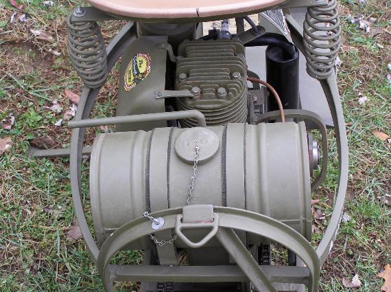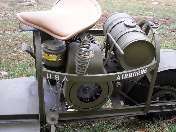 | Parachute D-Ring located behind the handle bars, above left photo. Parachute D-Ring located behind the gas tank, above right photo. The Cushman 53 Scooter was designed specifically to be air dropped by parachute. |