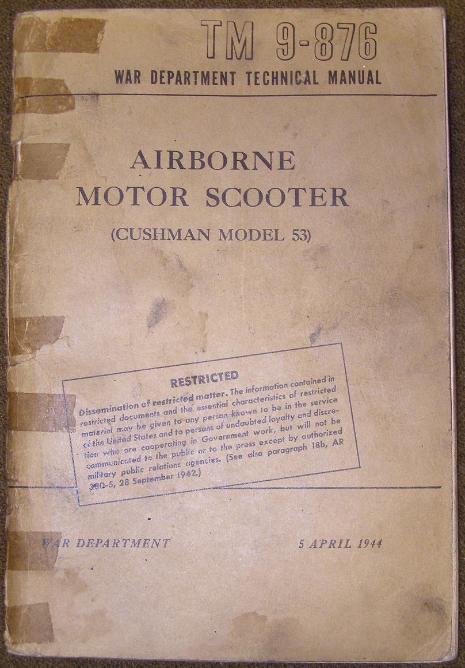 | TM 9-876 Technical Manual for the Cushman 53 Airborne Motor Scooter Dated 5 April 1944, above left photo. New Old Stock (NOS) Brake Lining Set in shipping box, above right photo. |