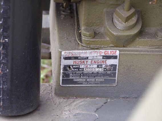 | Engine nomenclature plate, above left photo. This plate is marked: CUSHMAN AUTO-GLIDE MODEL 53 HUSKY ENGINE MODEL 16 M 71 HP 4 ENG. NO. A20629 |