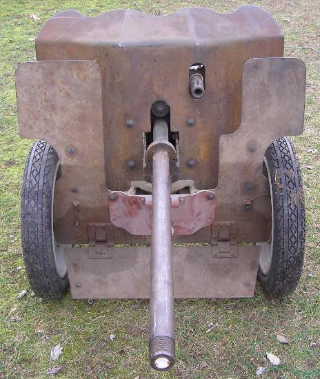 | 1934 French 25mm Hotchkiss AT Gun, front view, above left photo. The top of the barrel in front of the shield is marked with the serial number 1221, above right photo. |