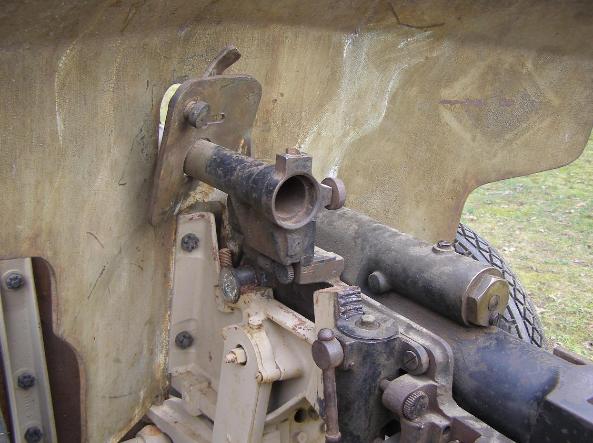 | 1934 French 25mm Hotchkiss AT Gun Breech, above two photos. This cannon has been painted tan at some point after World War Two, but traces of winter white camouflage paint can be seen under this paint. Also visible are the traces of what may be a unit marking on the right rear of the gun shield. The optical sight is missing from this cannon. QuestMasters is currently looking for this optical sight. |