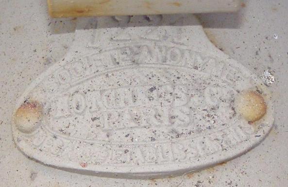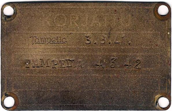 | Finnish Army data plate, above left photo. This brass data plate was added by the Finnish Army to the left inner trail leg of this Hotchkiss Cannon. KORJATTU, meaning repair or maintenance, is marked at the top of the plate. The plate carries two dates: 3.3.41. - March 3rd 1941 and 4.3.41 - March 4th 1942. Tampella was a heavy industry manufacturer, which is where this cannon was inspected. Carriage data plate, above right photo. This data plate is mounted on the center front frame, below the barrel. The plate is marked: 1221 SOCIETE ANONYME HOTCHKISS PARIS DES ANC ETABLISSEMENT. |