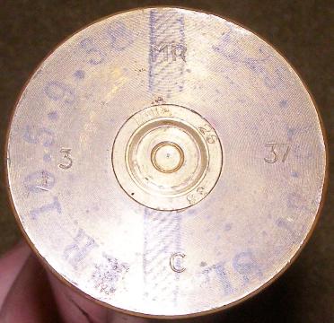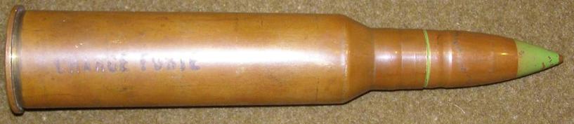 | 25mm Hotchkiss Shell, above and right photos. This shell consists of a brass shell casing marked: CHARGE FORTE on the side and dated March 1937 on the bottom. The shell is copper with a green painted tip. |