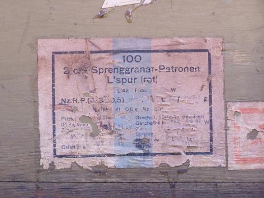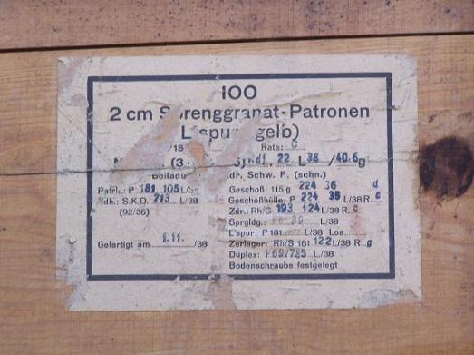 Ammunition box label for 2cm Incendiary (Brand) High Explosive Ammunition (Sprenggranatpatronen) with Red (rot) Tracer (L'spur), above left photo. Note very late 1945 production date. Ammunition box label for 2cm Incendiary (Br.) High Explosive Ammunition (Sprgr-Patronen) with Red (rot) Tracer (L'spur), in steel shell casings (blue vertical stripe), above right photo. |