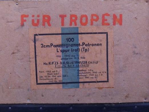Ammunition box label for 2cm High Explosive (Sprenggranat) Ammunition (Patronen) with Yellow (gelb) Tracer (L'spur), above left photo. Ammunition box label for 2cm Armor Piercing (Panzergranat) Ammunition (Patronen) with Red (rot) Tracer (L'spur) Tropical (Tp) in steel shell casings (blue vertical stripe), above right photo. |