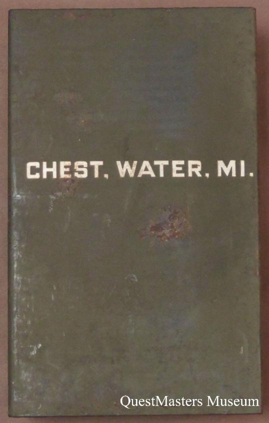 WWII Browning M-1917A1 .30 caliber, water-cooled, Machine Gun M-1 Water Chest, left and above photo. This example is marked on the front: CHEST, WATER, M1. The M1 Water Chest was used to collect the steam produced from the M-1917A1 to collect it back into water and pour it back into the water jacket. Water was used to cool the barrel during firing. The example shown left and above is the second model of this can. |