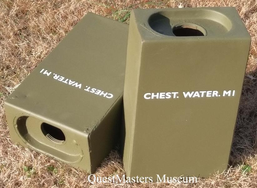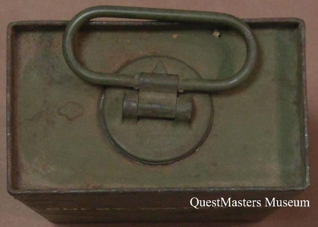 WWI Browning M-1917 .30 caliber water-cooled machine-gun M-1 Water Chest, left photo. This example is marked on the front: CHEST, WATER, M1. The M1 Water Chest was used to collect the steam produced from the M-1917 to collect it back into water and pour it back into the water jacket. Water was used to cool the barrel during firing. The example shown left and above is the first model of this can. The three examples in the QuestMasters Museum collection were found in England in 2012. These cans were scrapped after WWII and were found in horrible condition at the scrap yard. They have been restored by QuestMasters. |