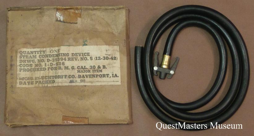 WWII Browning M-1917A1 .30 caliber water-cooled machine-gun steam condensing hose, left photo. This example was produced UCHTORFF COMPANY, DAVENPORT IOWA The hose is Drawing Number D-35394 Revision Number 5, December 30th 1942 and packaged July 1944 |