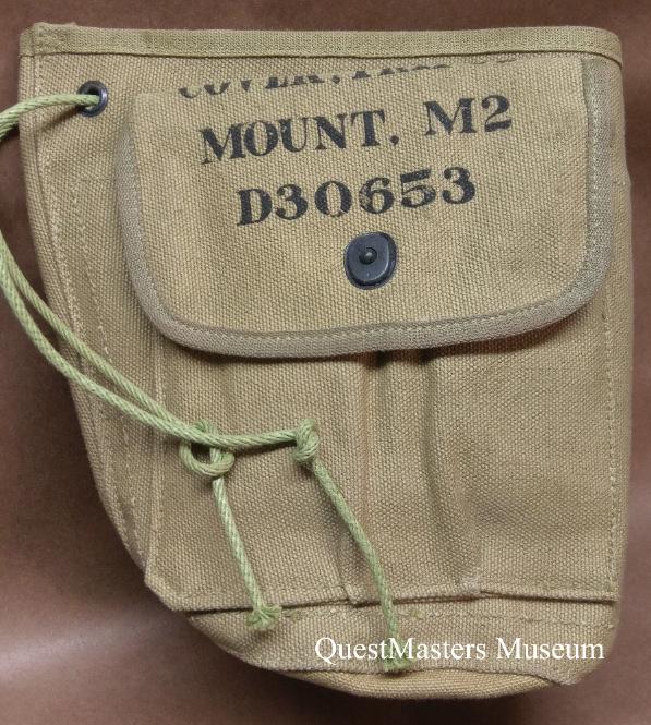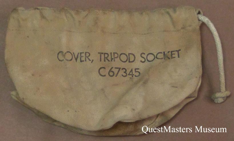 COVER, TRIPOD, MOUNT, M2 This canvas bag, Drawing D30653, was produced by CRAWFORD MFG. CO. INC. in 1943. The bag was made to go over the front of the M2 Tripod to protect the brass pintle socket. The pouch on the front was designed to hold the Transverse and Elevation (T&E) mechanism when not in use. The Pintle remained attached to the M-1919A4 Machine-gun when being stored. The example, shown in the left photo, is constructed from khaki canvas with a draw string closure. |