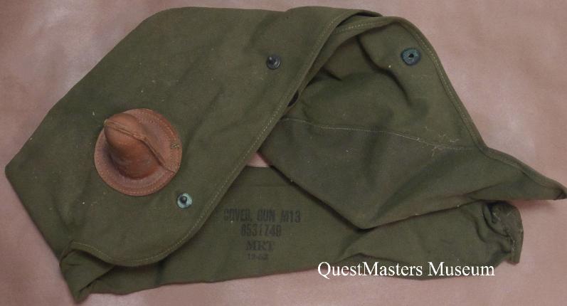 COVER, GUN, M13 This canvas bag, used to store the M1919A4 Machine-gun when not in use. This bag was produced in olive canvas with a leather fitting that covered the bolt on the receiver. This example is marked: COVER, GUN M13 8531749 MRT and was produced in December 1952. WWII examples should be marked D31749 |