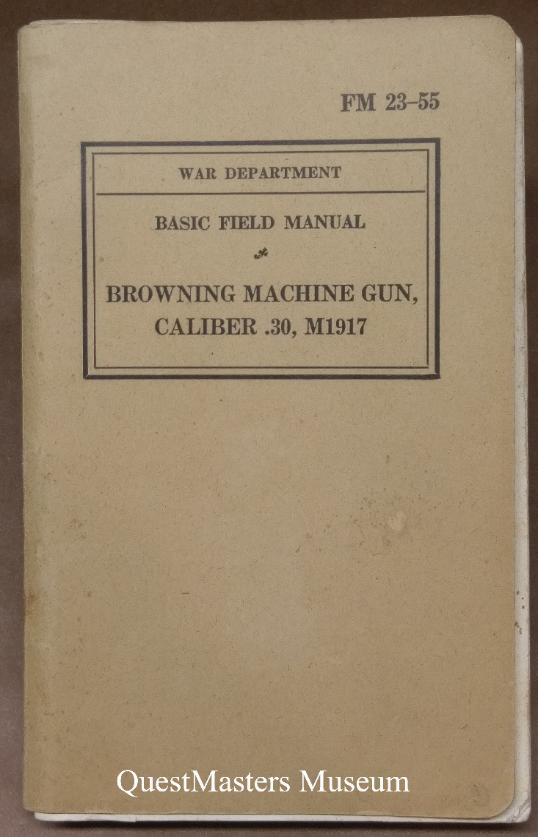 WWII Browning M-1917A1 .30 Caliber, water-cooled, Machine Gun, Field Manual FM 23-55, left photo. This is the War Department Field Manual for the Browning M-1917A1 .30 Caliber Machine Gun, produced by the War Department June 20th 1940, under the direction of the Chief of Infantry. 327 Pages with Change 1, dated July 25th 1941 and Change 2, dated May 6th 1942. |