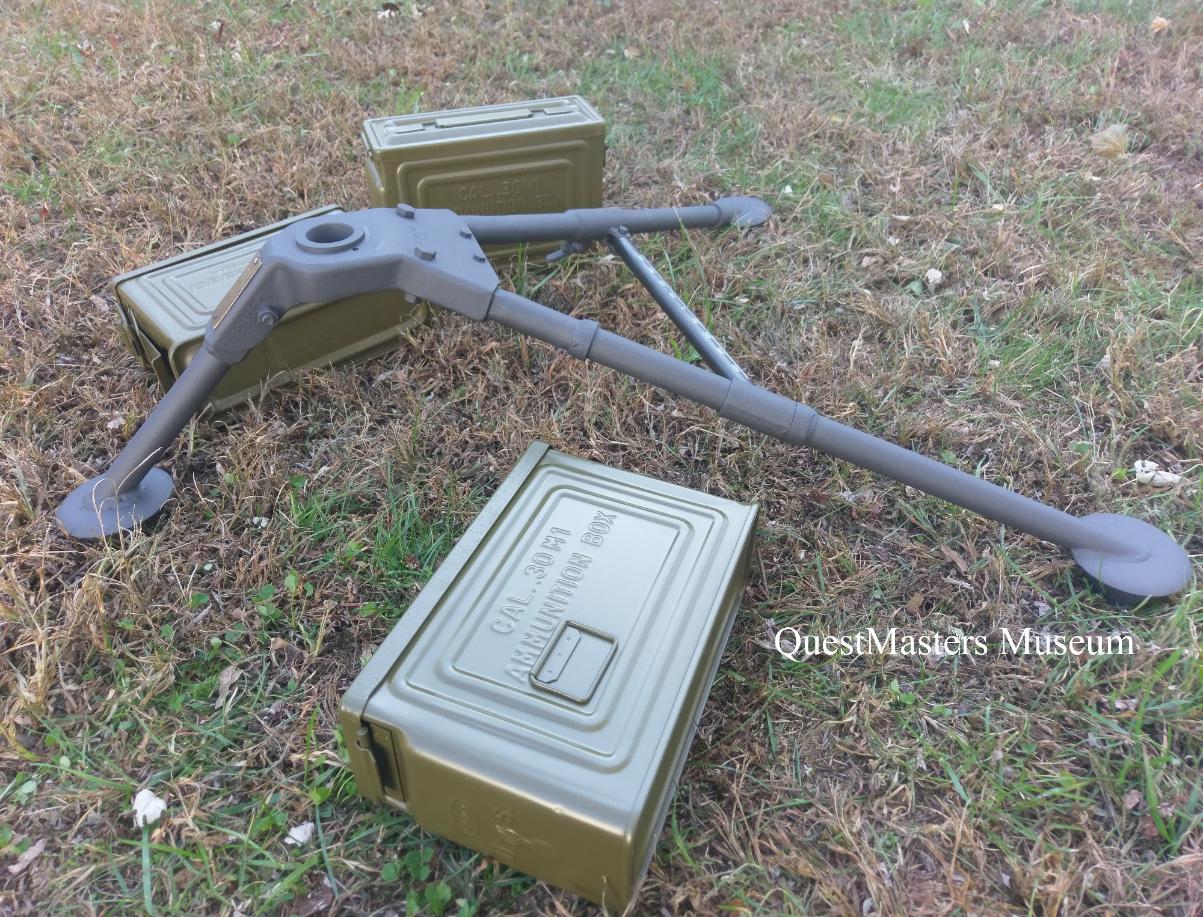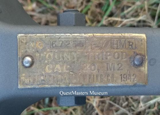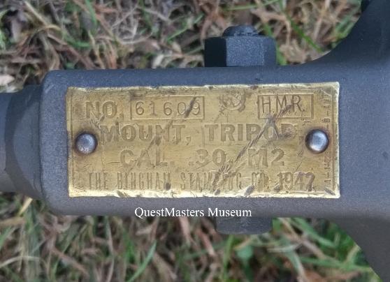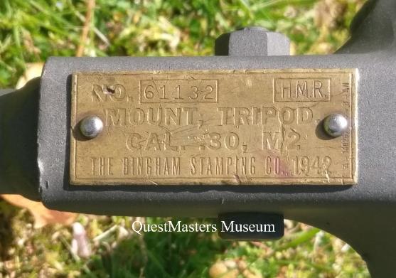 MOUNT, TRIPOD, CAL. .30 M2, Serial Number 61609, inspected by HMR with crossed cannon inspection stamp, manufactured by BINGHAM STAMPING COMPANY 1942, left photo. The top, rear of the mount is marked with a B and the flaming bomb ordnance stamp |