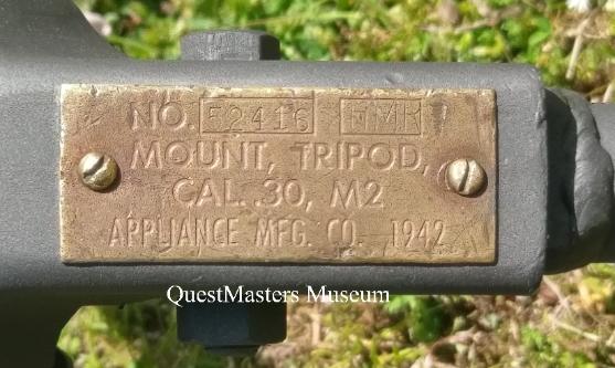MOUNT, TRIPOD, CAL. .30 M2, Serial Number 52416, inspected by HMR, manufactured by APPLIANCE MFG. CO. 1942, left photo. The top, rear of the mount is marked US-M2-L-C59331 (the L is in a C circle) |