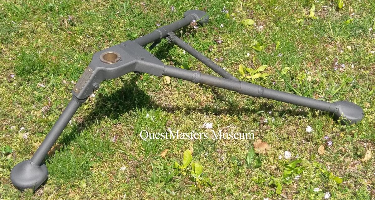 1942 Browning M2 .30 caliber machine-gun tripod, above photo. This M2 tripod was restored by QuestMasters in 2019. The entire tripod was sandblasted to bare metal and finished in Brownells Baking Lacquer #083-037-024, Dark Parkerizing Gray. The transverse bar was re-blued with increment marks added in white paint. WWII tripods originally were delivered from the factory in a gray parkerized finish. This tripod was produced by LAMSON in 1942, and has a variation of cupped feet on all three tripod legs. LAMSON was the only manufacturer to produce tripods with this style of feet. |
