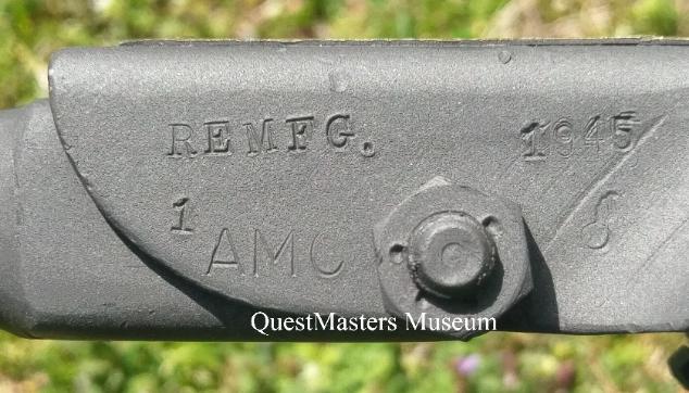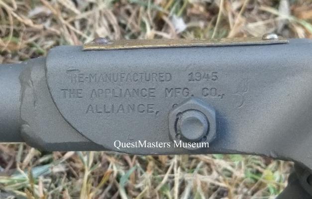 MOUNT, TRIPOD, CAL. .30 M2, Serial Number 97546, inspected by RLB, manufactured by LAMSON 1942, above left photo. MOUNT, TRIPOD, CAL. .30 M2, Serial Number 97546, manufactured by LAMSON 1942. The side of the front leg has been re-marked: REMFG. 1945 AMC (THE APPLIANCE MFG. CO. ALLIANCE OHIO), above right photo. |