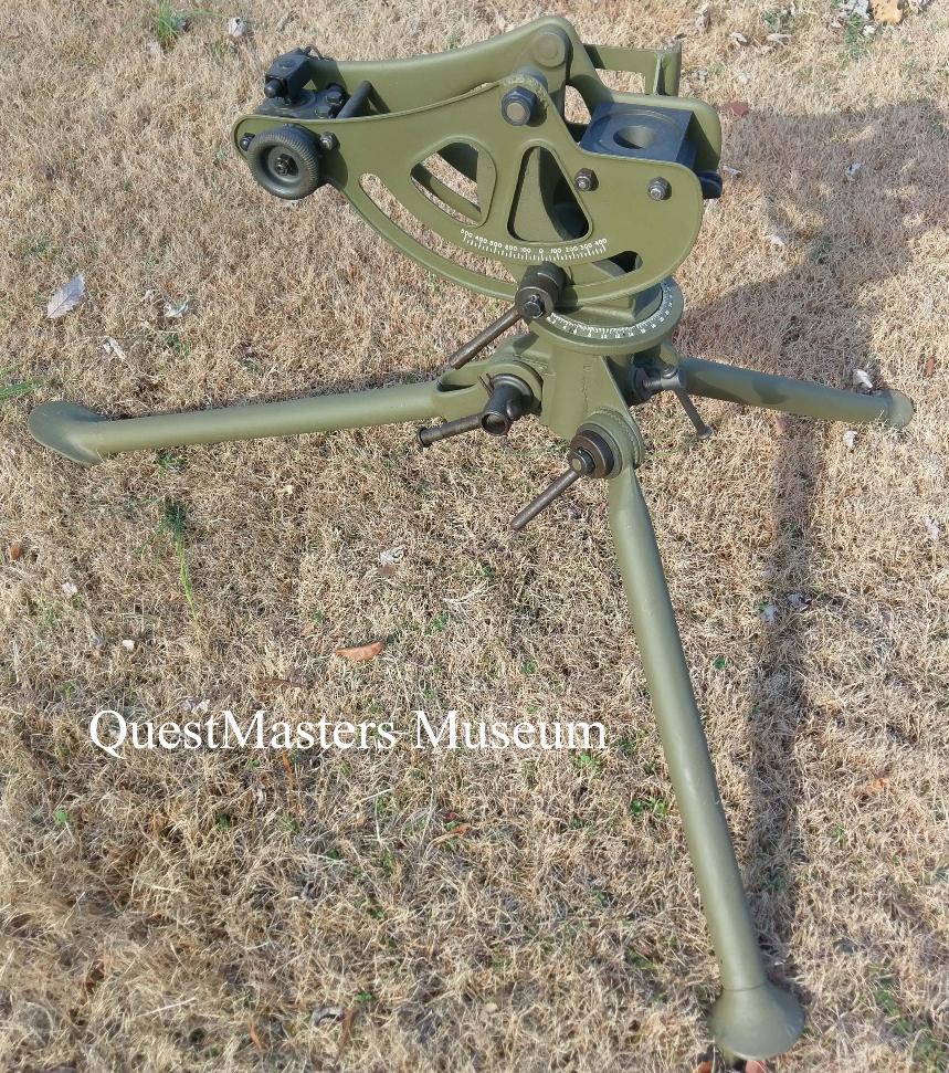 WWII Browning M-1917A1 .30 caliber machine-gun tripod, above photo. This M-1917A1 tripod was restored by QuestMasters. The entire tripod was sandblasted to bare metal and finished in olive drab paint. The transverse and elevation mechanism, pintle block, adjustment handles and bolts and nut have been parkerized finished. The azimuth and elevation increment marks have been re-painted in white. |