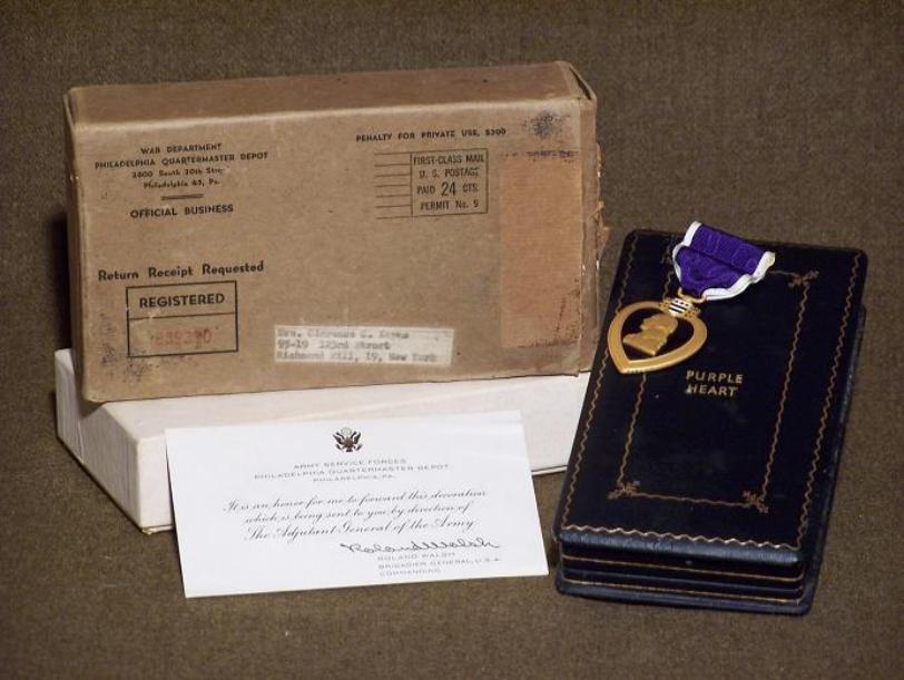 | PFC Keyes was awarded the Purple Heart Medal for being Killed In Action (KIA). His medal was sent to his wife Mrs. Louise Marie Keyes in a small cardboard box after his death. The box was sent by the War Department Philadelphia Quartermaster Depot to Mrs. Clarence C. Keyes, 95-19 123rd Street, Richmond Hill, Long Island New York. The cardboard box contained the Purple Heart Medal engraved with his name on the rear. The medal was mounted in a leather covered case that contained a card from Brigadier General Ronald Walsh, Commanding Officer Army Service Forces Philadelphia Pennsylvania. The card extended the honor of presenting this decoration on behalf of The Adjutant General of the Army. The price of postage was 24 cents. |