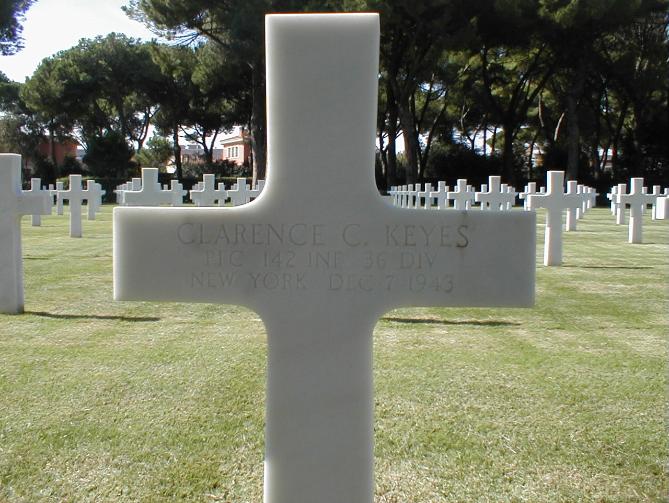 | REPORT OF DEATH PFC Keyes was killed on December 7th 1943 with a shrapnel fragment wound (SFW) in the skull, near La Defensa Italy. PFC Keyes was buried in an isolated burial at approximately 1645 hours December 14th 1943 next to William A. Henkelman 38036606 142nd Infantry Regiment (grave 5). PFC Keys was the end of the row (grave 6). Personal effects found with his body during disposition were: 1 pair of glasses with case, photos, a cigarette lighter, 2 rings, a knife, misc. coins, several religious articles, a billfold, 13 Lire, $1 American Currency, a money order receipt for $25 #18767, 1 Silver Dollar and a plastic cigarette case. These items were forwarded to his next of kin Mary Keyes, his mother, 279 Moffet Street, Ridgewood, New York. PFC Keyes was reburied at 1555 hours February 3rd 1944 Marzanello Nuovo Cemetery, Italy - row 1 grave 9 next to Warren L Gordon 36454100 (grave 10) and Willis C Locker 13065140 (grave 8). PFC Keyes was disinterred on September 9th 1948 and buried in the American Cemetery Nettuno Italy - Plot I, Row 3, Grave 61. He rests there to this day. His beneficiaries were Louise M. Keyes (wife) Mary Keyes (mother) and Lillian Timinsky (sister). |
