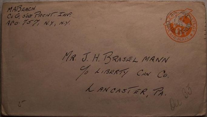 | Envelope or "Cover", above photo. This envelope was mailed by (Rank Unknown) Merl A. Beach on September 1st 1945 to Mr. J A Brazelmann of Lancaster Pennsylvania. |