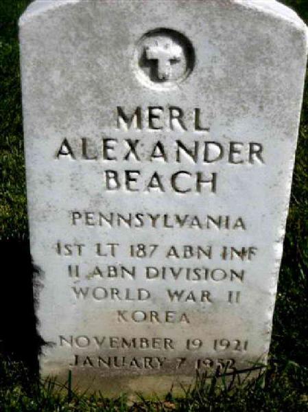 | SERVICE HISTORY OF MERL BEACH Merl Beach entered service on July 15th 1942, New York. He served as a member of G Company, 3rd Battalion, 508th Parachute Infantry Regiment, 82nd Airborne Division. Merl Beach served as an Enlisted Man (EM) during WWII. Following the War he joined a National Guard Unit and earned a Commission as an Officer. 1st Lt. Beach went on to serve in the Korean Conflict and was Killed In Action (KIA) on January 7th 1952 in South Korea. 1st Lt. Beach is buried in Section M, Site 603, Golden Gate National Cemetery, San Bruno California. |