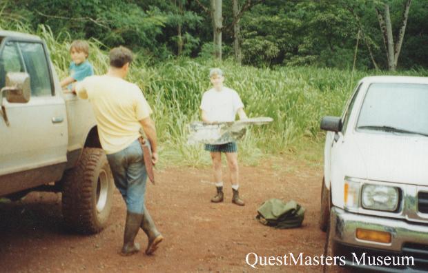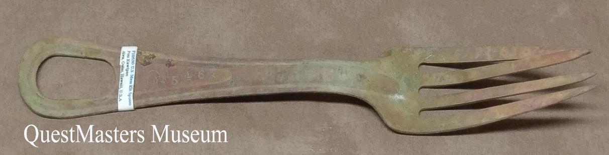 | U.S. Army Mess Kit Fork, above photo. This U.S. Army Mess Kit Fork was found under very unusual circumstances. While exploring the Puu Uau Ridge, Oahu, Hawaii, several miles past the crash site of B-24J-155-CO 44-40332, a food and water break was taken on the ridge while looking for other WWII aircraft crashes. During this break, this fork was noticed sticking out of the ground - with no other items or wreckage in sight. The fork is owner stamped F5463. These markings are known as a laundry number, the initial of the owners last name: F and the last four digits of their Army Serial Number: 5463. This fork may have been dropped by one of the WWII U.S. Army wreck searchers, or military training done there during WWII, high-up in the mountains of Oahu, Hawaii. QuestMasters Museum recovered the fork in 1995. |