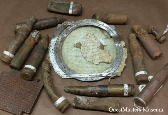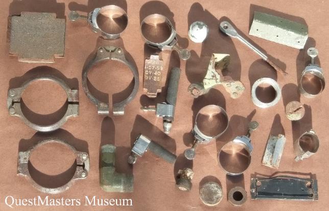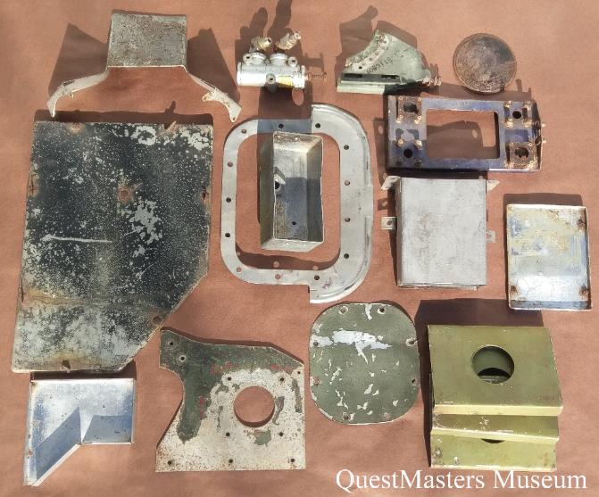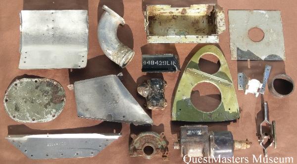 | The following WWII aircraft items were recovered by QuestMasters Museum between 1995 and 1996, from WWII aircraft scrapping operations done on Oahu, Hawaii, at the conclusion of the war. All of these items, shown below, remain in the QuestMasters Museum collection. Some artifacts, not pictured, have been transferred to other museums for presentation or to be used in WWII aircraft restoration projects. Identified WWII U.S. aircraft parts that were found and recovered, were removed from the following aircraft Pacific Campaign WWII aircraft: B-17, B-24, B-25, B-26, P-61, P-51, P-40, P-38 and T-6. Many of these parts are a mix of removed parts and unused parts. Not all of the parts have markings to identify the type of aircraft that they were removed from or what aircraft they were intended to be installed on. |